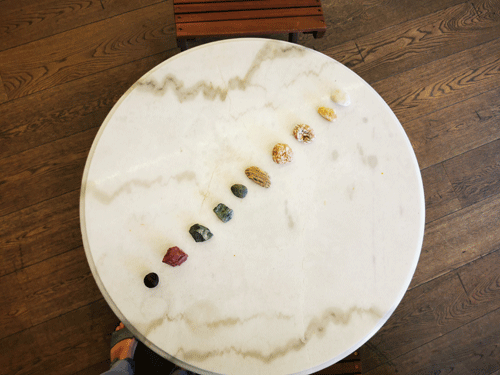 An einer Art Spieltisch konnte man – gemeinsam – Kieselsteine bewegen. Einzige Regel: die Steine so lange zu verschieben, bis beide (alle) mit dem entstandenen Bild zufrieden sind. Auf diese Weise kamen im Laufe des Tages etliche verschiedene Steine-Bilder zustande.