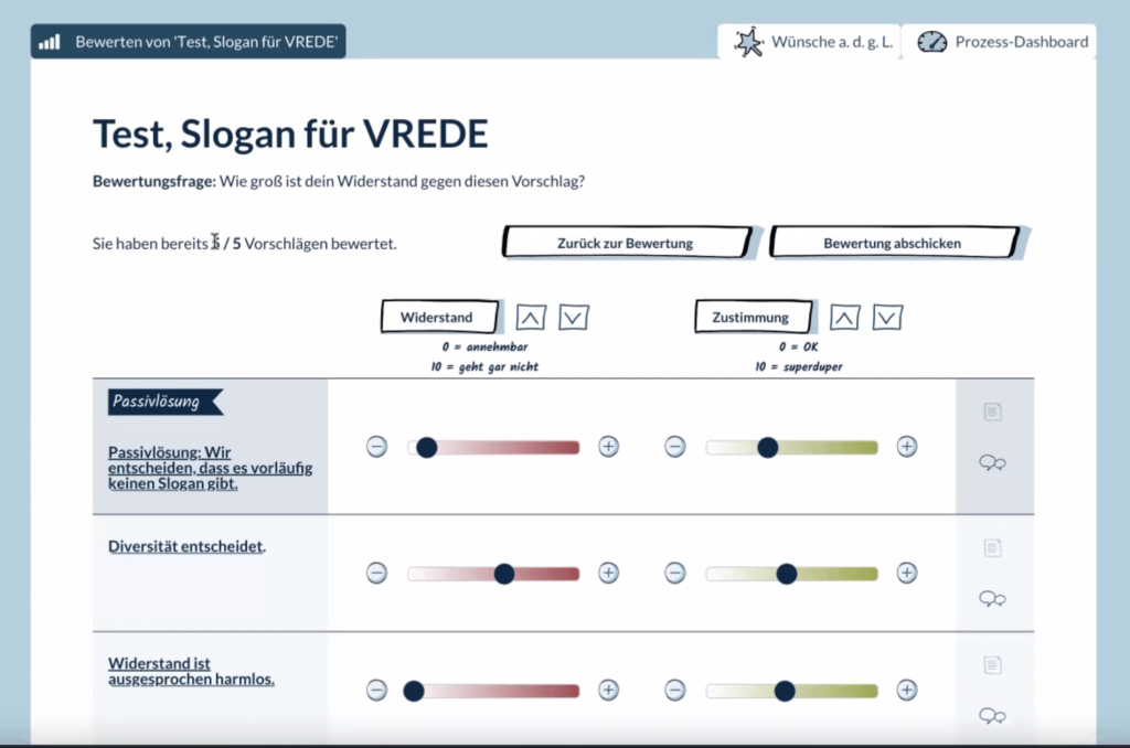 Im Rahmen des Laura Bassi Practitioner Day am 23. Juni 2022 kamen erste Elemente von VREDE öffentlich zum Einsatz. Die Teilnehmer:innen bewerteten mögliche Slogans für das Projekt VREDE nach Widerstand.